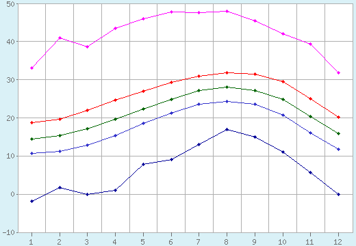 Miesiąc | Absolutne minimum | Średnie minimum | Średnia | Średnie maksimum | Absolutne maksimum |