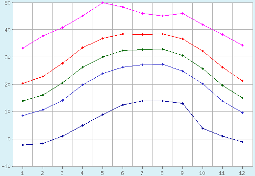 Miesiąc | Absolutne minimum | Średnie minimum | Średnia | Średnie maksimum | Absolutne maksimum |
