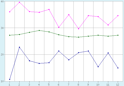 Miesiąc | Absolutne minimum | Średnie minimum | Średnia | Średnie maksimum | Absolutne maksimum |