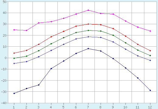 Miesiąc | Absolutne minimum | Średnie minimum | Średnia | Średnie maksimum | Absolutne maksimum |